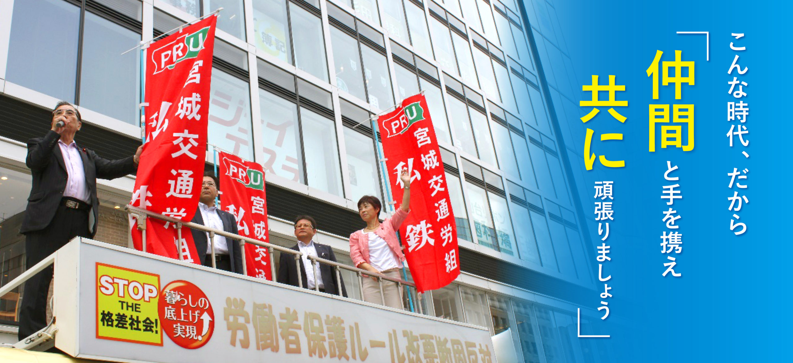 鉄道、バス、ハイヤー・タクシー、その他様々な職場で働く仲間のみなさんと手を携えて、宮城交通労働組合は、今の職場、世の中を変えていきます。